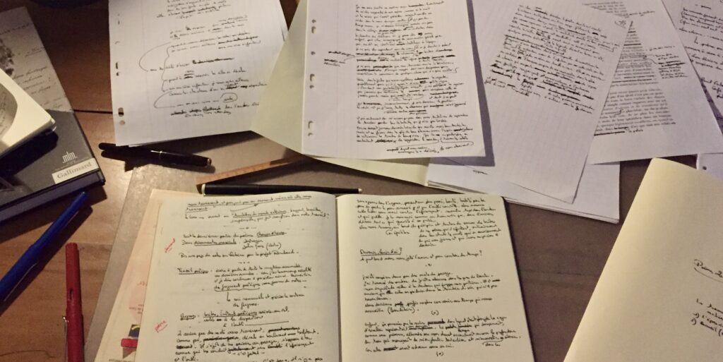 Ecrire — Sur la table de travail et nulle part ailleurs. Face à l’écran, l’ordinateur portable à main gauche, clavier et cahier à portée de main, passant indifféremment de l’un à l’autre, le Bic de couleur noire pour écrire, le Bic de couleur verte pour souligner, le strict nécessaire donc. Ecrire pauvre. Dos en compote. Seul luxe, comme un rituel, le murmure étouffé d’un quatuor à cordes pour ajouter au charme désuet de l’instant.