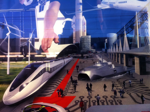 Etrange, après mon repérage de la semaine dernière, et le fait que dans 3 semaines à peine je débarquerai avec mon sac sur l’île de ciment pour n’en pas sortir de 8 jours, de voir proliférer dans métros et gares cette image du parvis transformé en exhibition futuriste, bateaux, trains, éoliennes, et cette main qui surgit pour les arranger comme des jouets. C’est bien la Défense, on reconnaît l’immeuble Coeur Défense devant le CNIT (où j’aurai devant la FNAC chaque jour de 13h à 14h et 17h30 à 18h30, une permanence publique avec 2 ordis connectés avec Internet libre, accessibles aux visiteurs, qui pourront ainsi suivre mon travail et y participer via petite proposition d’écriture). Mais l’image est trafiquée, la bouche circulaire de la gare, plantée devant le CNIT, est en fait au pied de la Grande Arche, de l’endroit même où est censé être prise cette vue. En même temps j’aimerais bien, pour ma semaine Défense, une représentation 3D du même genre où je pourrai regarder ma petite silhouette se balader sous les tours et dans tous les recoins à écrire. Tiens, quand j’y serai, j’écrirai tous les jours une lettre à Karl, à cause de la fusée.