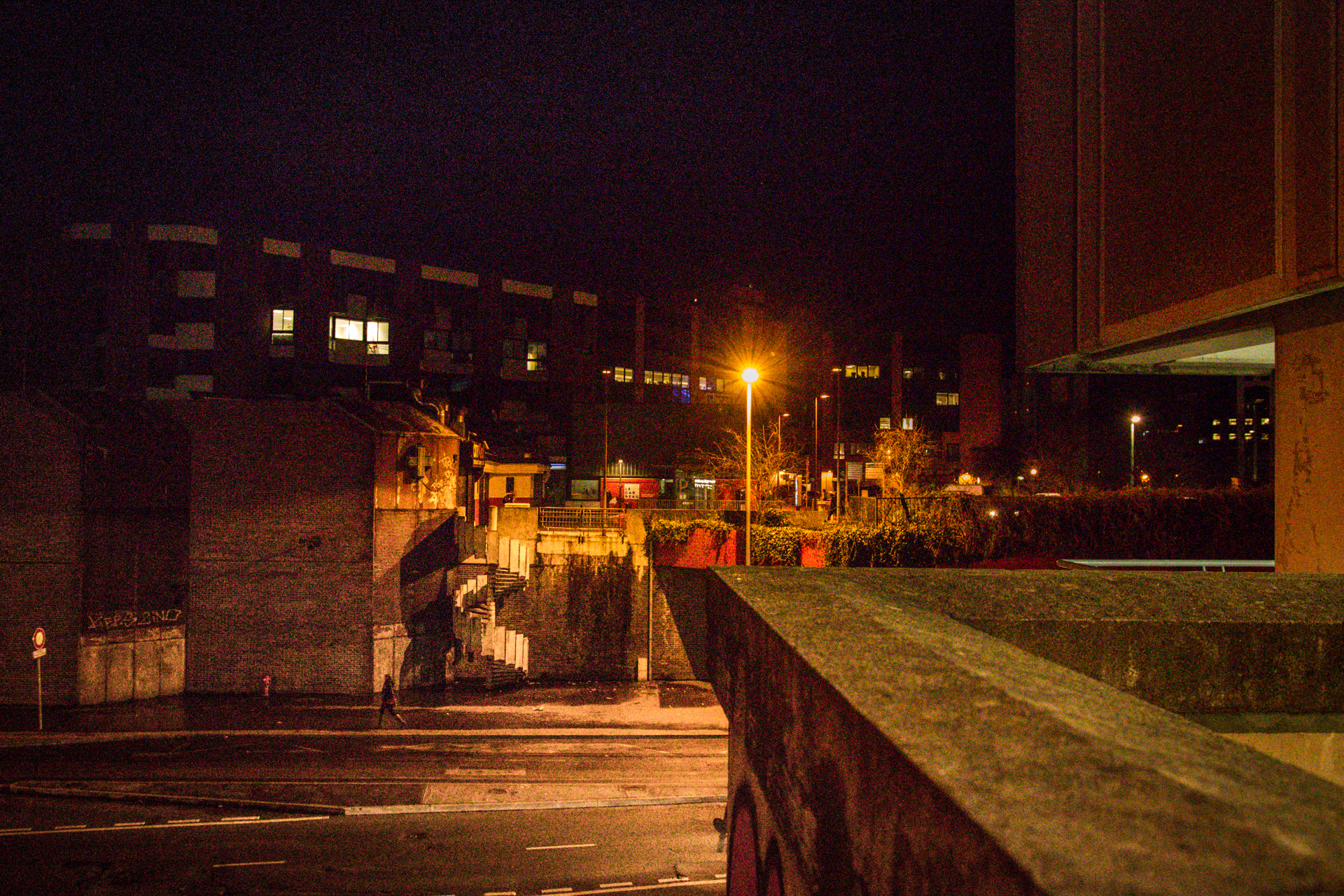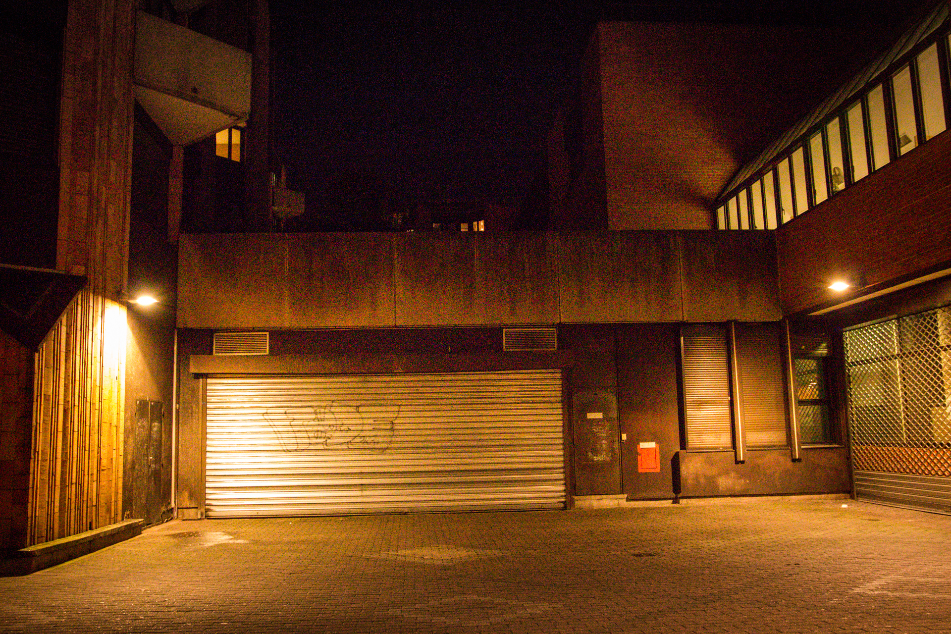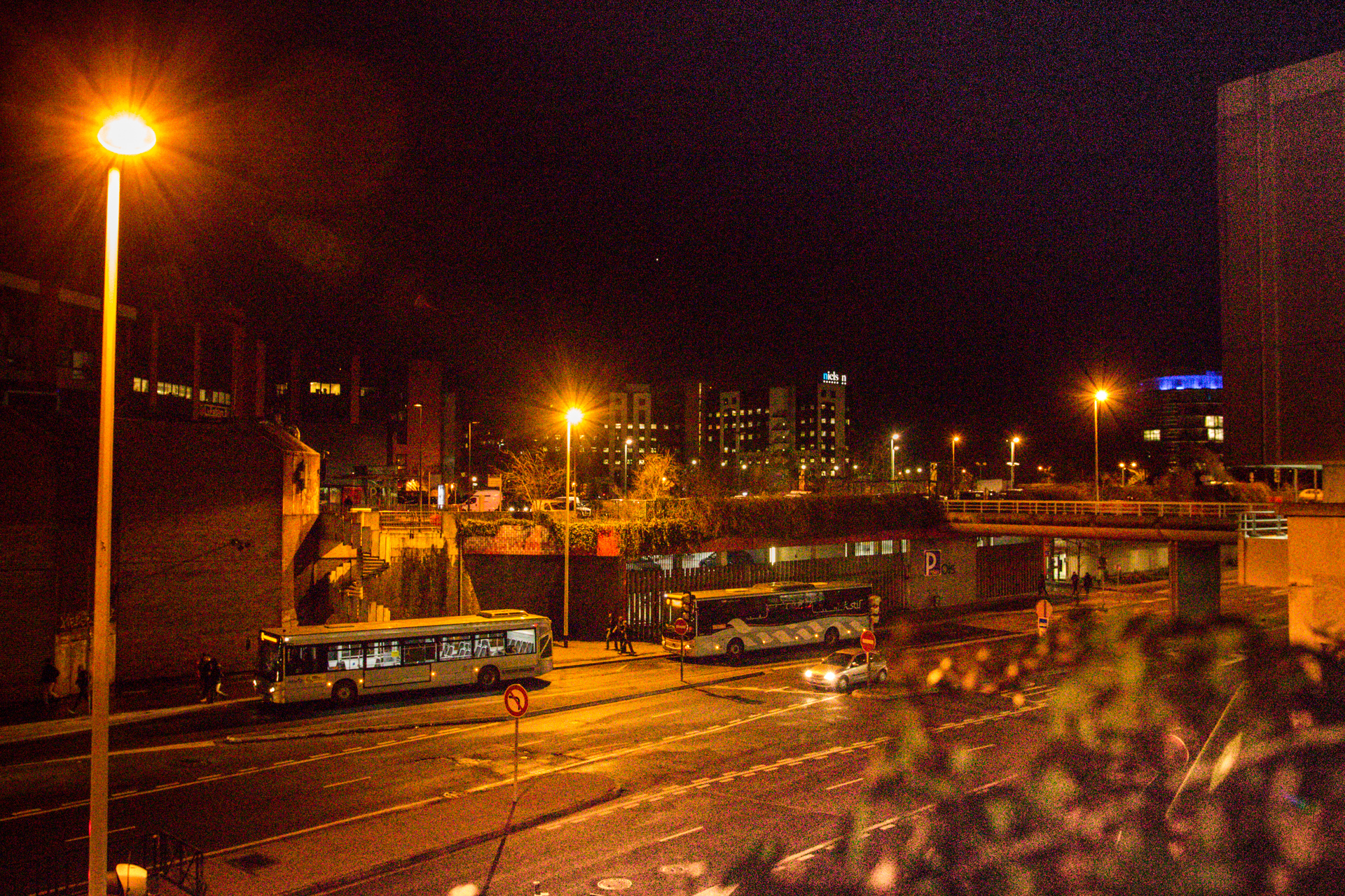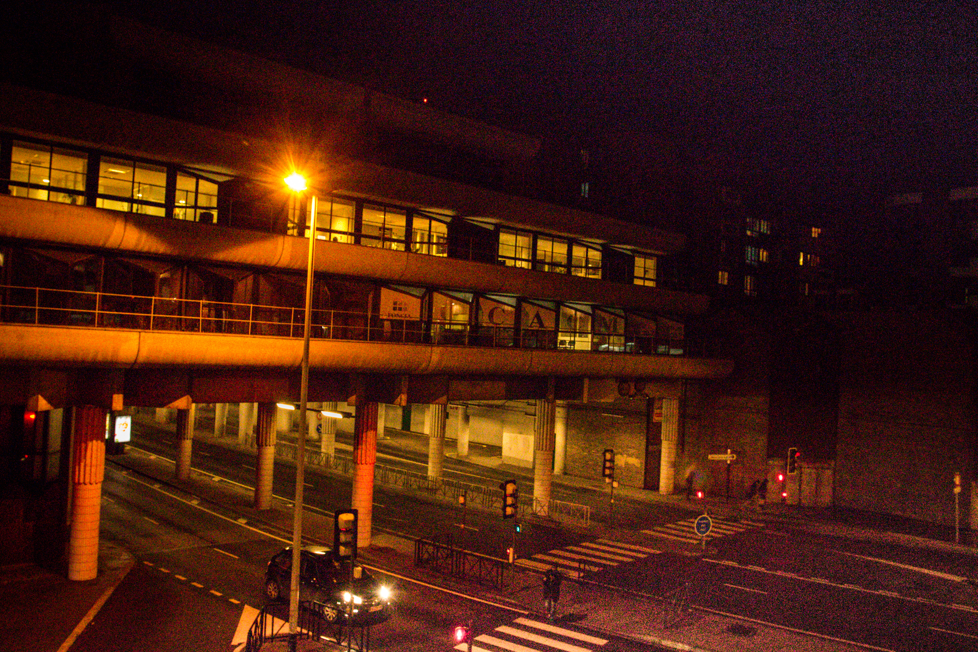 Non, je ne suis pas revenu à Cergy. Ça se fera peut-être, mais plus tard : ces communautés très structurées comme une école d’art sont aussi très confinées, elles se referment après départ et c’est très bien. Je me souviens de ce sentiment de clandestinité la première fois que j’étais revenu à la villa Médicis, « en étranger », et de toute façon ça ne manque pas. Changer de taf tous les cinq ans ça devrait être une sorte d’hygiène, on doit repartir dans les trappes noires pour avancer. Non, plutôt qu’un soir où je serais coincé à Paris et obligation raquer pour un hôtel, réserver là-bas au Formule 1 (ex Kyriad) où j’ai dû dormir un peu plus de 150 fois (moins, les derniers temps, y avait quand même lassitude) et se faire juste un shoot de nuit sur la vieille dalle — actuellement ils l’ébrèchent pour retrouver porosité, ces modèles de ville nouvelle se sont révélés obsolètes. Juste les lieux déjà photographiés 30 fois, mémoire des pieds, et bam bam bam. Par exemple, ouvrant cette série du printemps 2015, alors que j’avais déjà commencé les vidéos en chambre, mais avant la bascule qui suivrait en juillet, cette certitude que je n’avais pas fini avec ce coin précis de la ville, en tant que scénographie : lieu pour performer et capter. La fiction en cinéma est aussi morte qu’en roman, la fiction naît d’autres processus d’immersion dans le réel, à commencer par la main qui tient l’outil. D’ailleurs c’est ce qu’on va essayer de faire au C19 à Evry, à l’autre bout de la diagonale urbaine, ville jumelle, un peu moins décatie ? Sauf que là-bas faudra faire avec les dealers et cette violence à même la peau de la ville, tandis qu’à Cergy jamais eu d’emmerde. Ce que je cherche, à revisiter ces images (j’aurais tellement voulu qu’on aille plus loin, dans ces logiques urbaines, dans le cadre de l’école, mais c’est toujours des logiques d’effleurement et c’est normal : c’est dans le désespoir qui commence après diplôme qu’on lâche les monstres, je reste ami proche d’assez d’anciens élèves pour le savoir — notre boulot, c’est de préparer les pistes qu’ils auront à retrouver seul.e.s), ce n’est pas un enfoncement ni un retour, c’est le fil très étroit qui doit me servir de socle pour les chemins à reprendre. Bizarrerie à les rouvrir dans LightRoom : c’était fait avec mon SIgma 18-35 1.8 qui, lui, est resté sur place, revendu à un étudiant, alors que maintenant il devient genre culte, cet objectif.