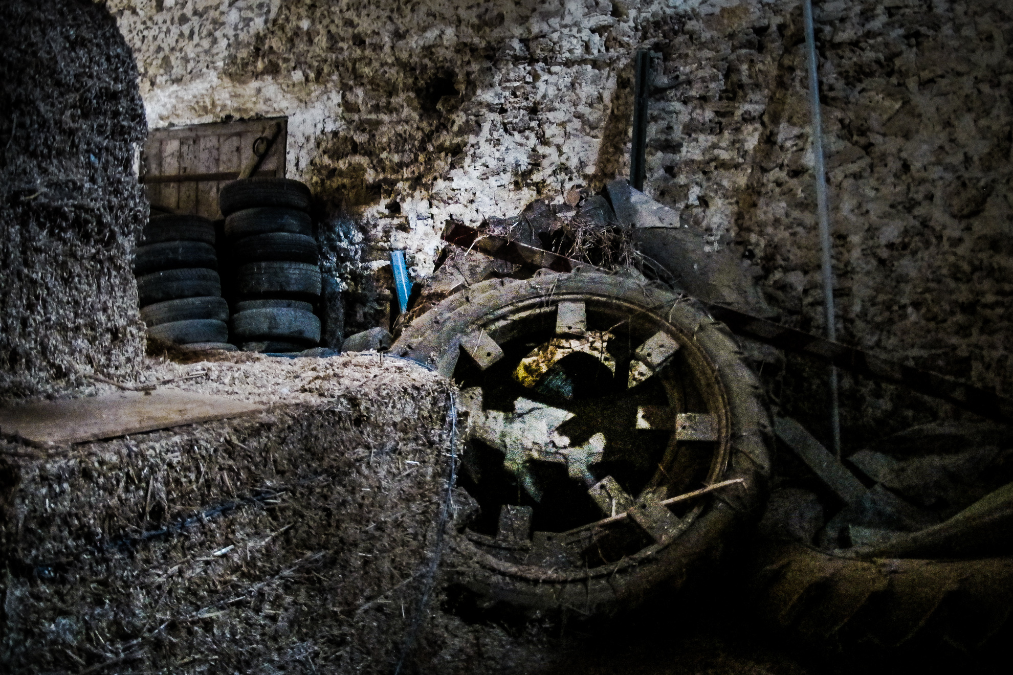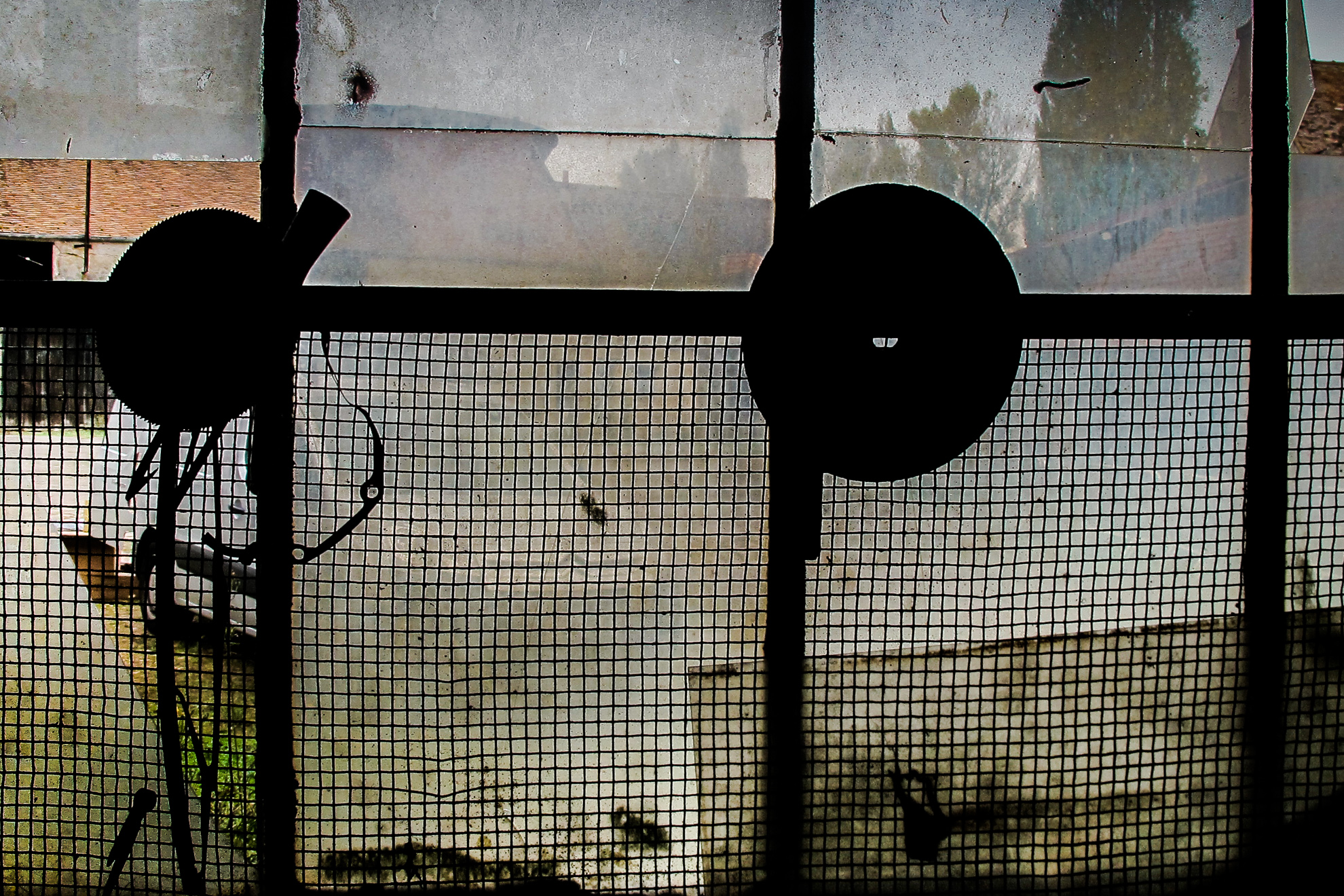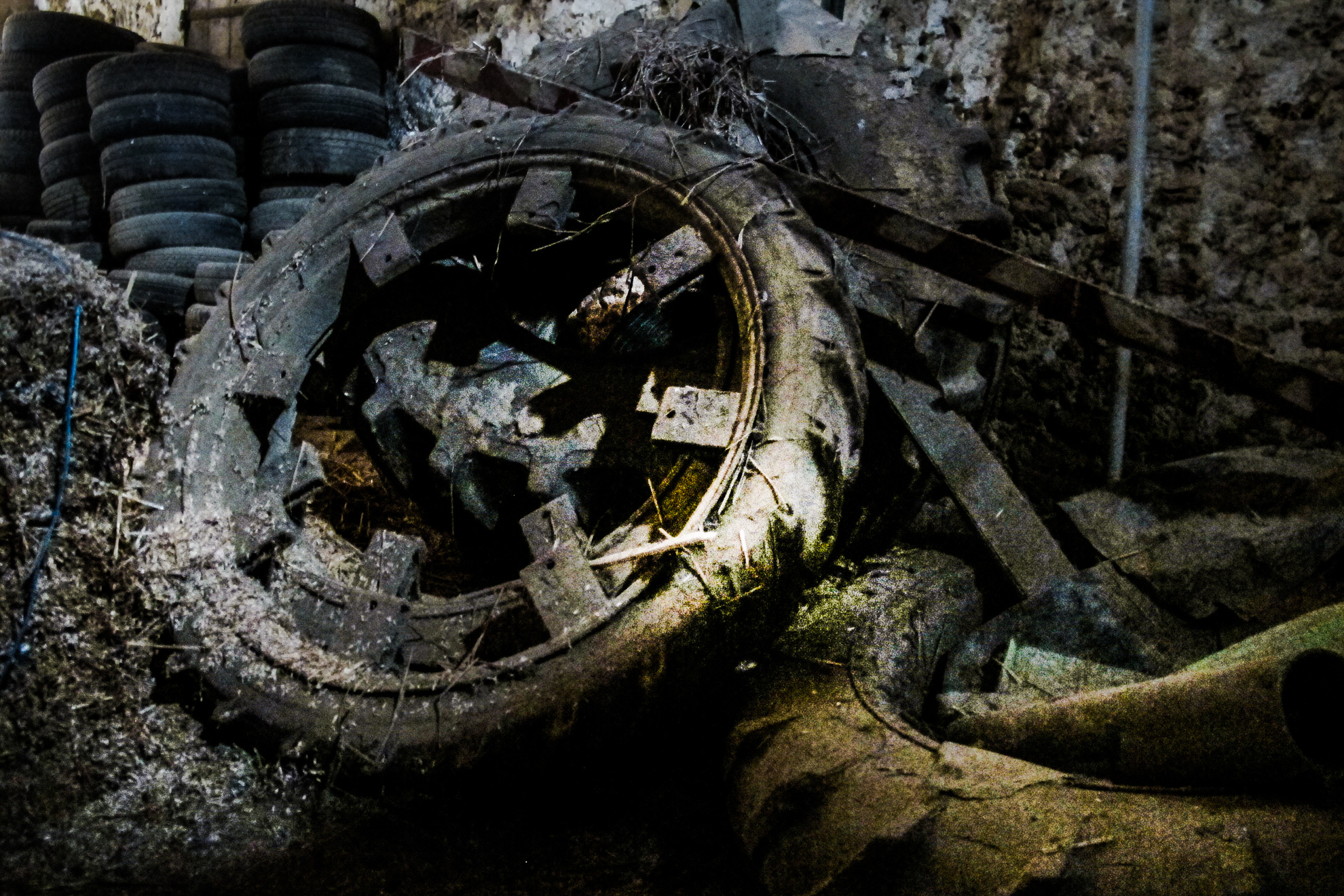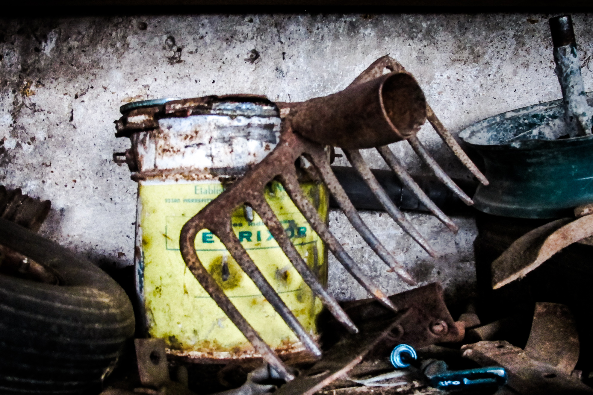 On cherche dans le disque dur, on aperçoit une composition lâche de signes qui accroche, on cherche à reconnaître, puis quelles photos avant, quelles photos après. Je ne pratique pas le taguage, il aurait fallu commencer plus tôt, alors je ne le fais pas. Pour savoir où est située une image, je regarde le jour, puis je remonte dans mon agenda sur Outlook, qui remonte jusqu’à 2003, avant il y a un trou, j’avais dû arrêter vers 1998 les agendas papier. Ce qui fait qu’il y a beaucoup de visages dans ces photos que je suis incapable de reconnaître, et pareil certains lieux. C’est aussi d’avoir souvent l’appareil sur moi, dès cette époque, mais de ne l’utiliser que par bouffée, rien pendant des heures et puis là 20 photos d’un petit coin de 6 mètres carrés. J’ai fini par retrouver où c’était et pourquoi j’étais là. Je m’en souviens parce que, ces photos, je les vois. Ça n’existait pas, en moi, en tant que souvenir, tant que les photos n’y étaient pas. Si vous êtes familier de mon site et que vous me dites où c’était (je pourrais faire liste d’au moins 5 personnes qui pourraient, et nota : non, ce n’est pas Damvix photographié récemment), je vous envoie un bouquin de la rentrée de septembre, en avant-première ! Reste qu’il y a toujours la même étrangeté, à ouvrir de tels lieux, qu’on semble tout y reconnaître, avoir tout touché, de toujours... Ou bien parce qu’on est soi-même ruine ou vestige comme ce lieu même, maintenant volatilisé ? Si je voulais demain retourner faire les mêmes images avec mon GH5, travailler mieux ce toucher que métal, pierre, rouille, pneu peuvent évoquer sur une image, je ne le pourrais pas. Le plus bizarre (mais je faisais souvent ça avec ce petit Canon G12), c’est d’avoir tout photographié au carré : prendre une tranche d’image en 3 x 2, et régler les surfaces en fonction d’un cadre qui n’aura existé que sur l’ordinateur au montage, est-ce que ça aussi change la nature de l’image ?