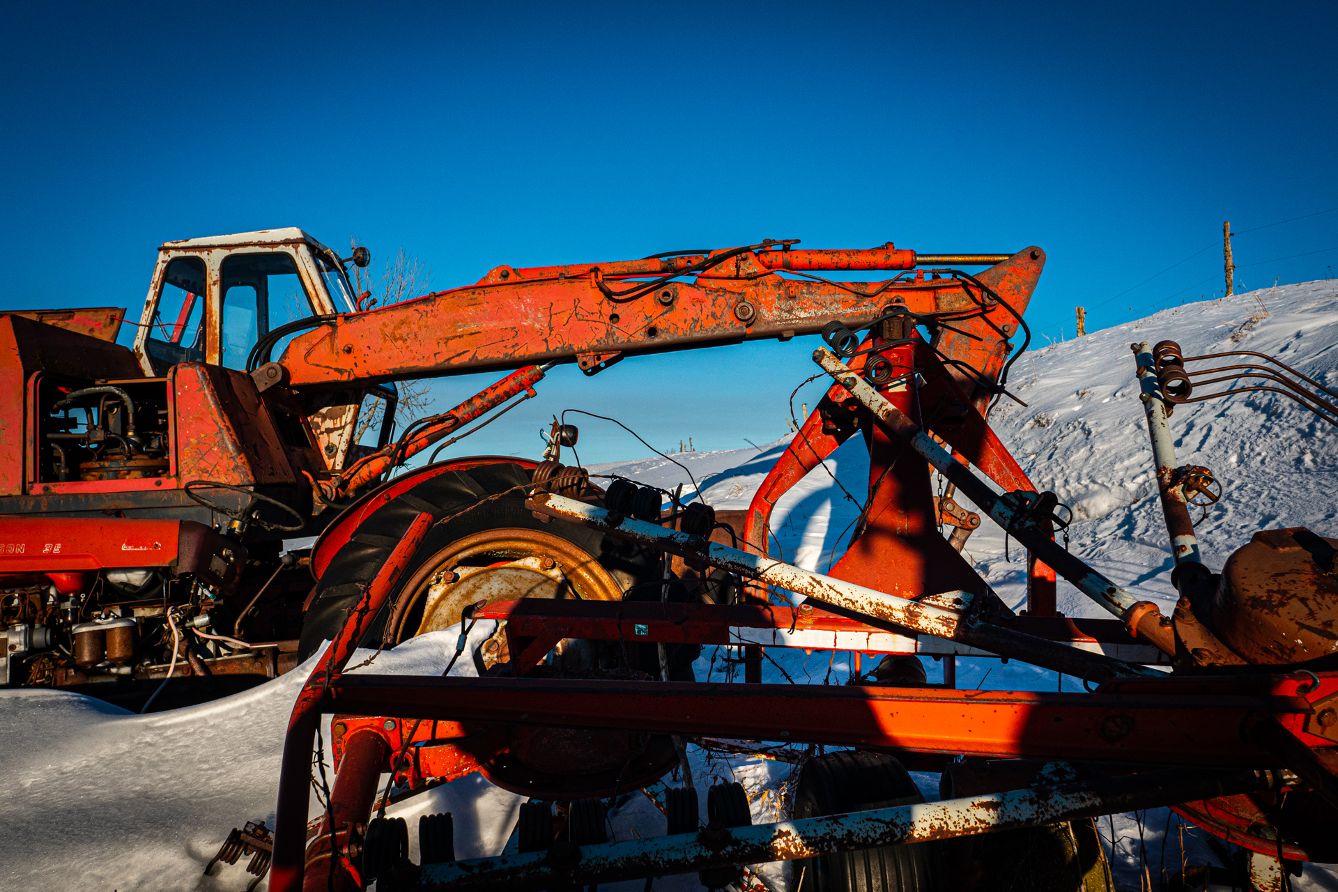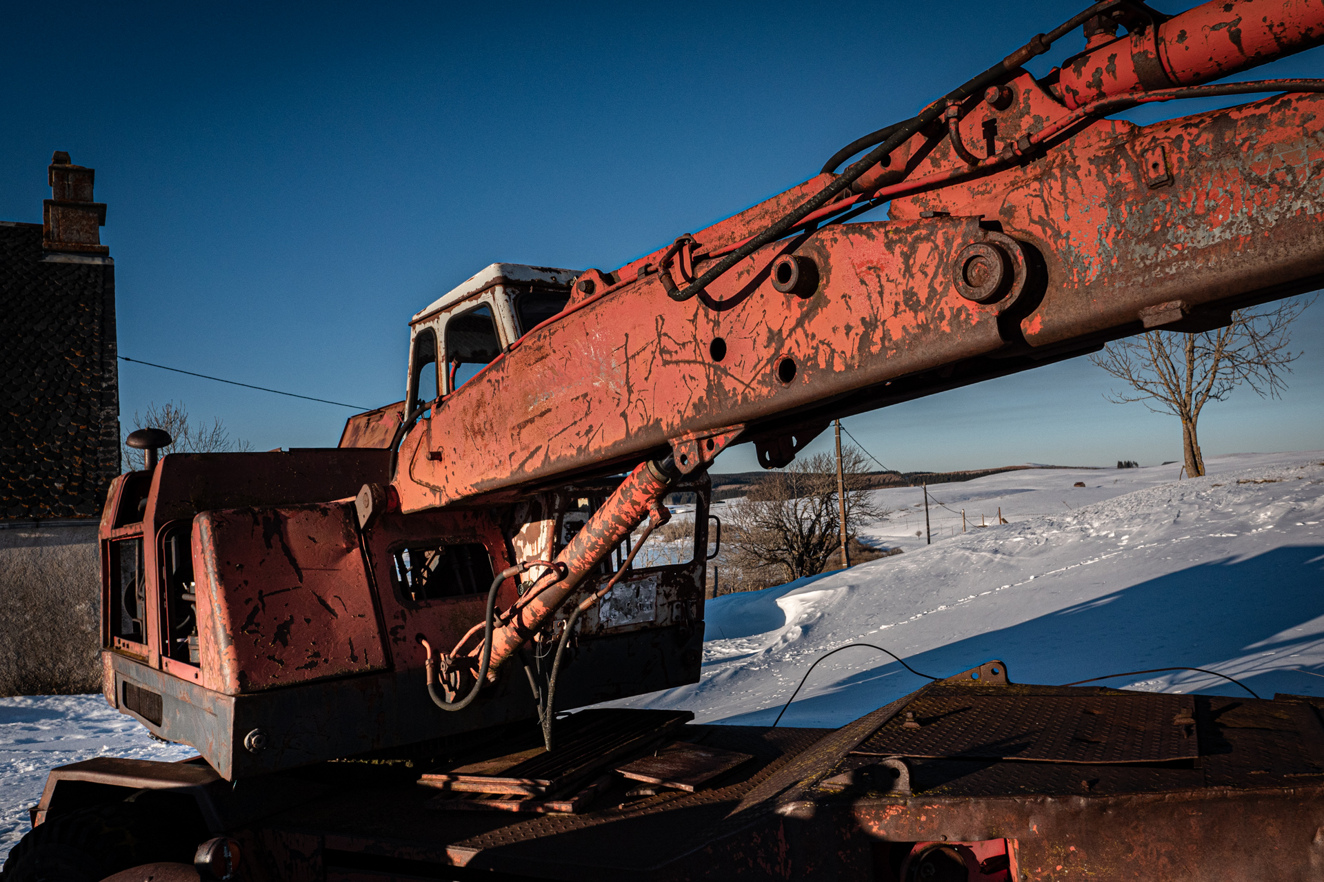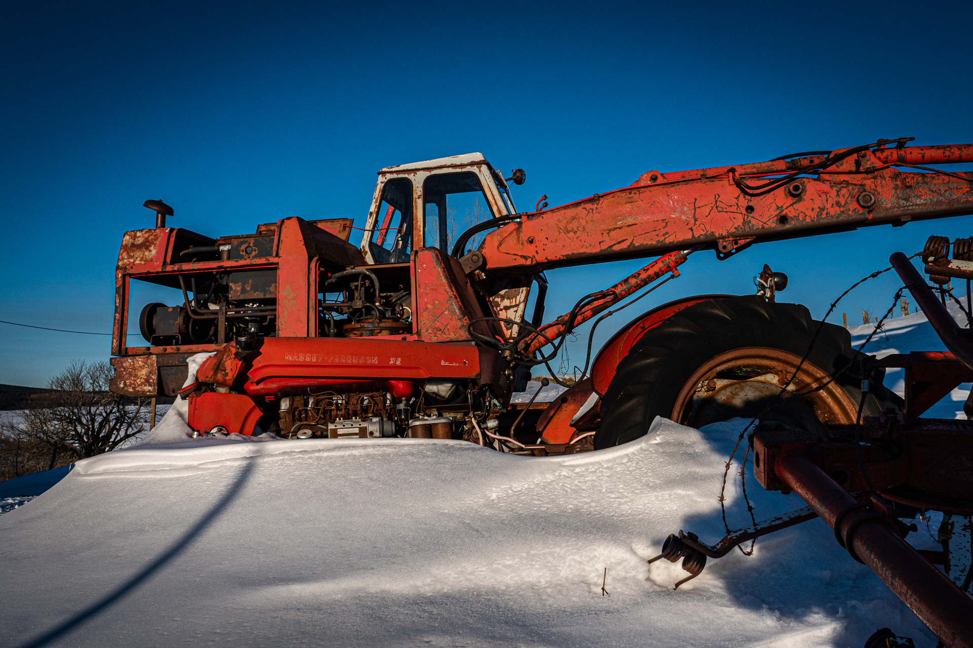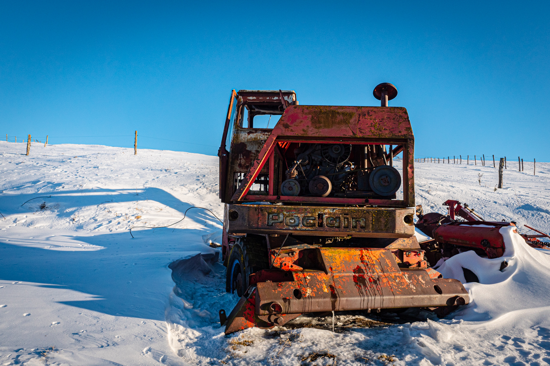 C’est un Georges Bataille, mais pas le nôtre, né en 1897, pris à 18 ans dans l’horreur de Verdun et démobilisé en 1919 avec Croix de Guerre, qui a fondé en 1926 l’entreprise Poclain (par contraction du nom de la mare devant sa ferme) et répare des tracteurs, construits des remorques. La pelle hydraulique Poclain, qui a fait toute notre enfance, est née en 1950. Poclain sera mangé par Case en 1974, et Case sera mangé par Fiat en 1989, maintenant dans nos chantiers on voit surtout des pelleteuses japonaises. Alors un brin de joie à demander à cette belle TY45, le best-seller absolu de l’entreprise et là en sa belle vieillesse face neige si elle m’autorisait à lui tirer le portrait... À noter qu’ici, où on ne laisse pas un animal seul aux champs, on lui a adjoint un petit Massey-Ferguson de son âge pour la retraite, c’est humain.