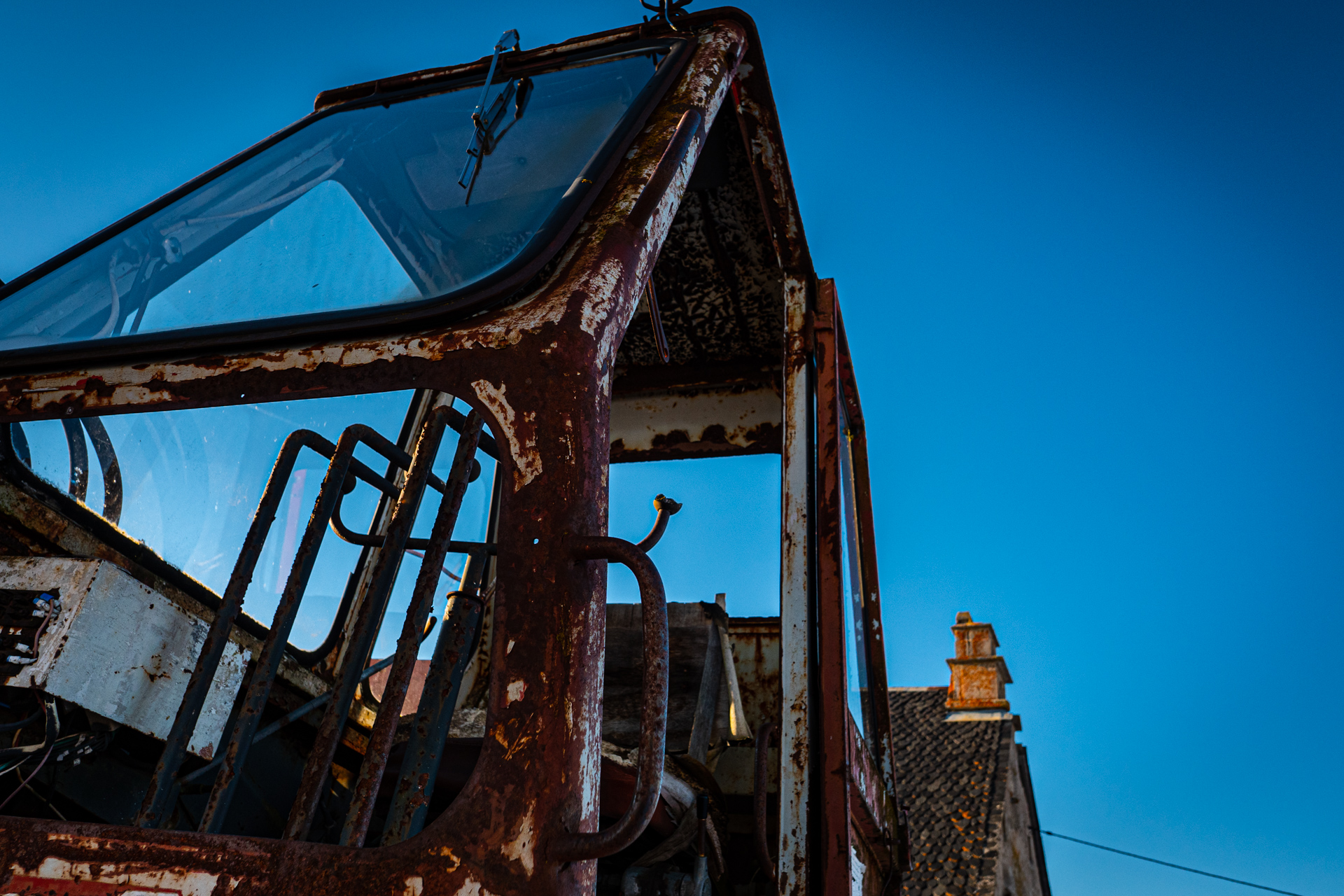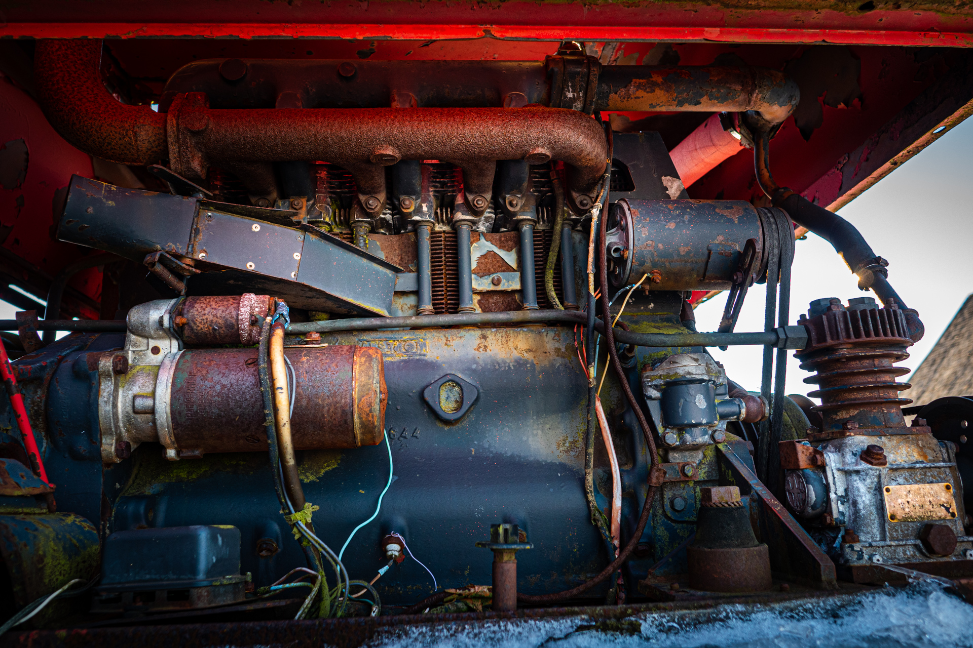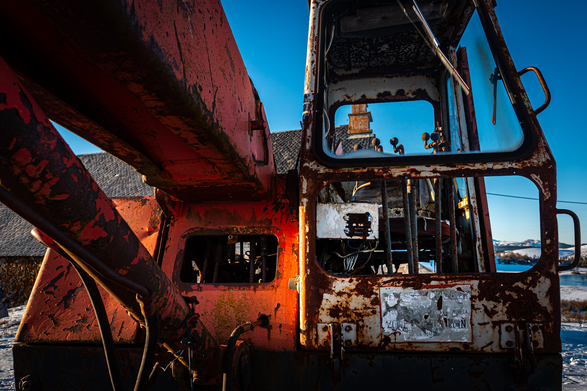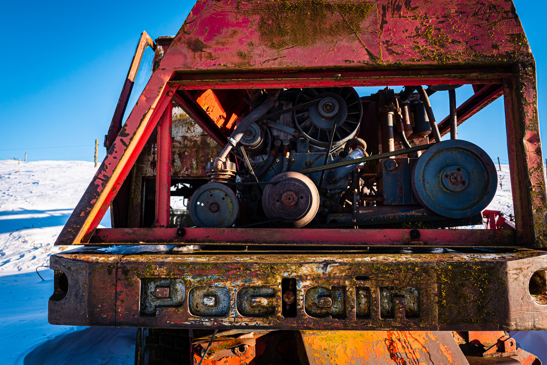 C’est un Georges Bataille, mais pas le nôtre, né en 1897, pris à 18 ans dans l’horreur de Verdun et démobilisé en 1919 avec Croix de Guerre, qui a fondé en 1926 l’entreprise Poclain (par contraction du nom de la mare devant sa ferme) et répare des tracteurs, construits des remorques. La pelle hydraulique Poclain, qui a fait toute notre enfance, est née en 1950. Poclain sera mangé par Case en 1974, et Case sera mangé par Fiat en 1989, maintenant dans nos chantiers on voit surtout des pelleteuses japonaises. Alors un brin de joie à demander à cette belle TY45, le best-seller absolu de l’entreprise et là en sa belle vieillesse face neige si elle m’autorisait à lui tirer le portrait... À noter qu’ici, où on ne laisse pas un animal seul aux champs, on lui a adjoint un petit Massey-Ferguson de son âge pour la retraite, c’est humain.