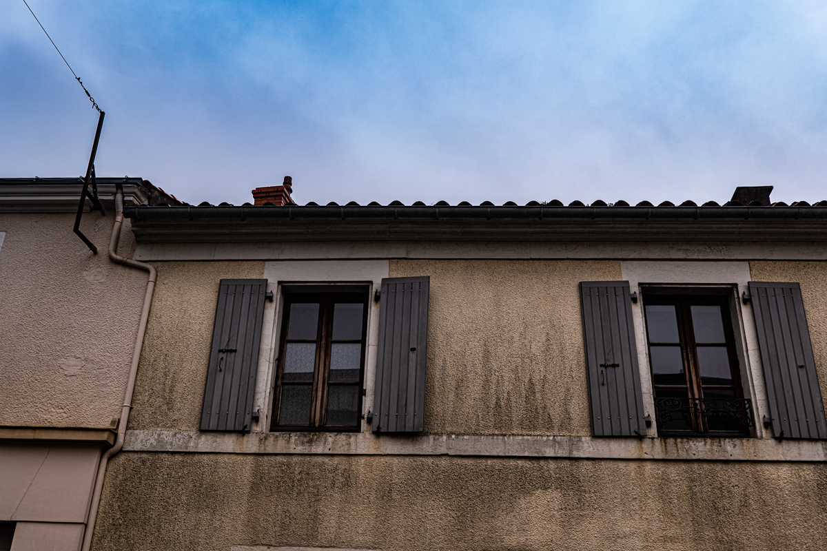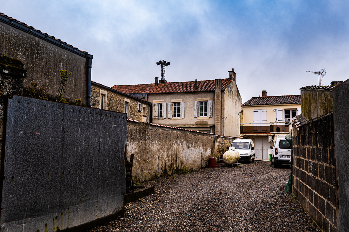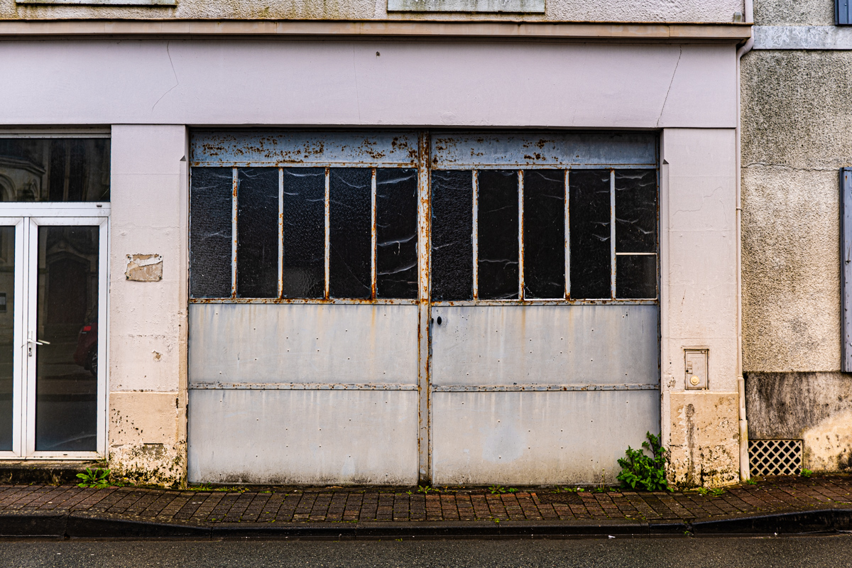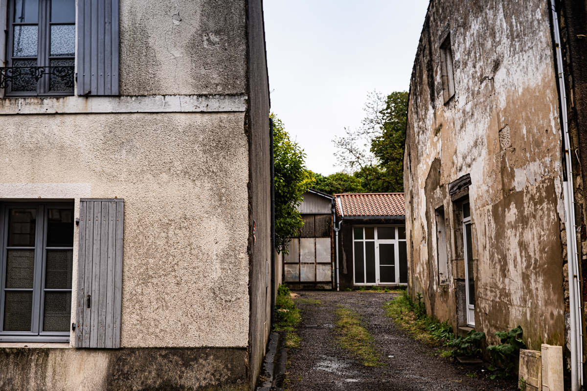 Éternel pèlerinage du même. Ce qu’on photographie existait tel quel encore en 1964, et c’est juste délaissé. Le temps gris et la pluie n’ajoutent rien à l’affaire. Et qu’évidemment on n’a pas le droit ni de sonner, ni d’entrer. Seulement, c’est en grande partie resté tel : c’est pour cela qu’on photographie. N’a pas été repeint. L’ancien bistrot restaurant d’à côté, démoli, le haut mur qui protégeait ma cour d’école primaire, démoli. La Boucarde, transformée. La maison d’enfance, bricolée à ne plus la reconnaître (sinon la glycine). Restent ces maisons basses, reste l’écart. Le délaissé du monde. Tu te heurtes à ces six décennies depuis la porte refermée, l’ensemble vendu ? Toi aussi, en toi, les mêmes décennies. Alors, ce que tu photographies, dans ce pèlerinage du même, c’est le même décrépi qui te définit ? Quand même le mot « passage ». On appelait ça « le passage ». Ça reste « le passage ». Si c’est le passage, une chance encore. Alors tu photographies.