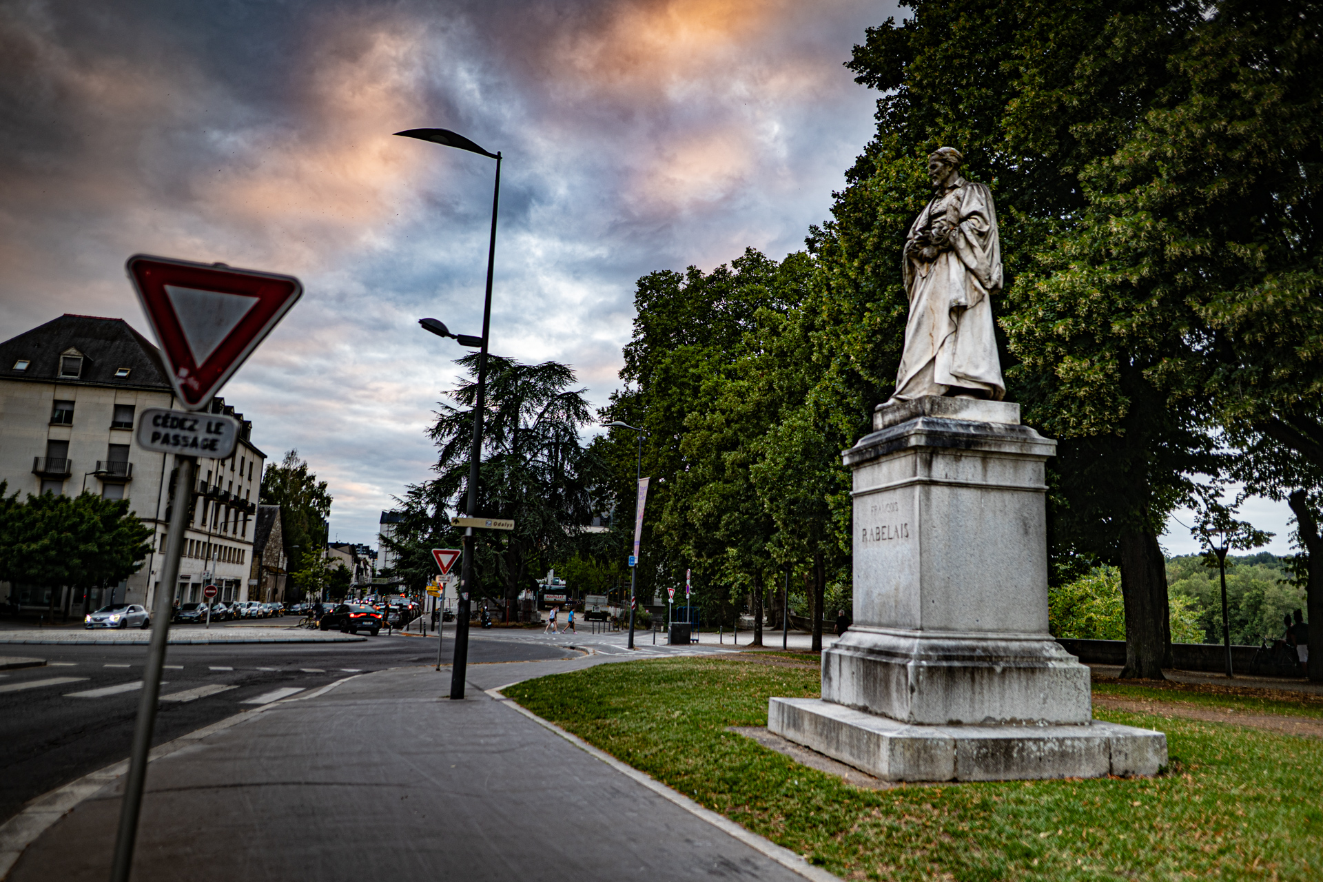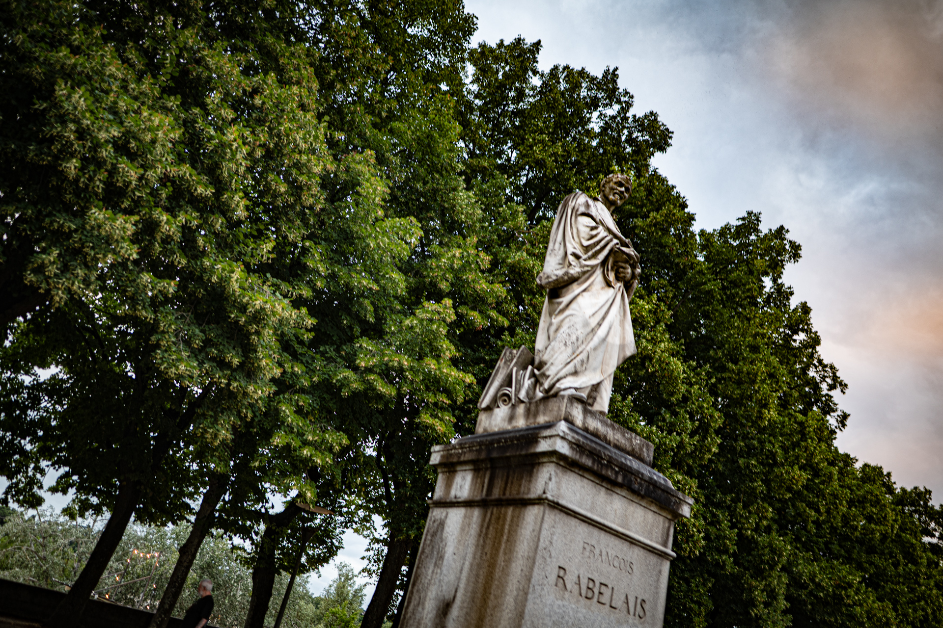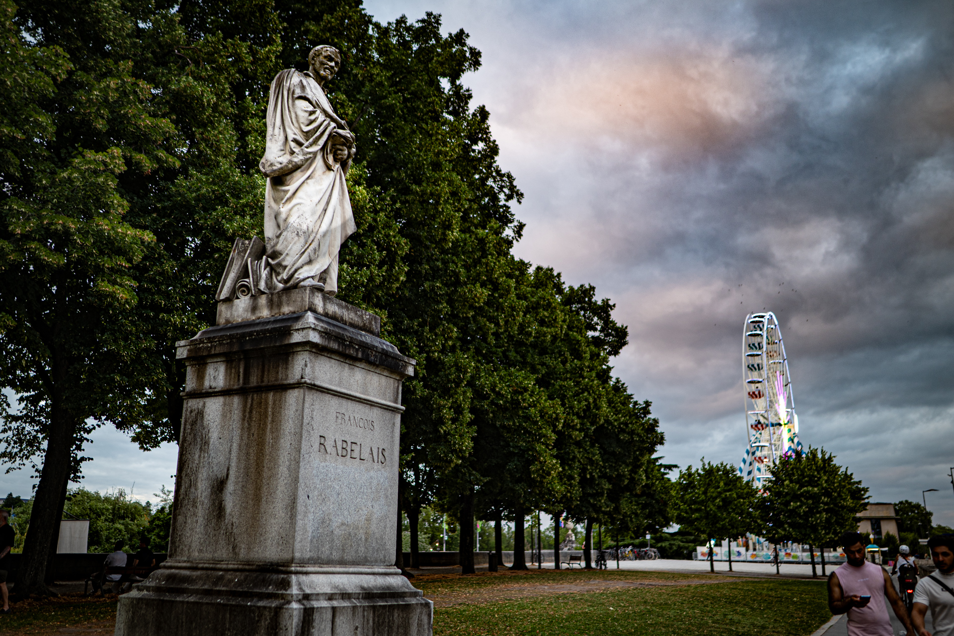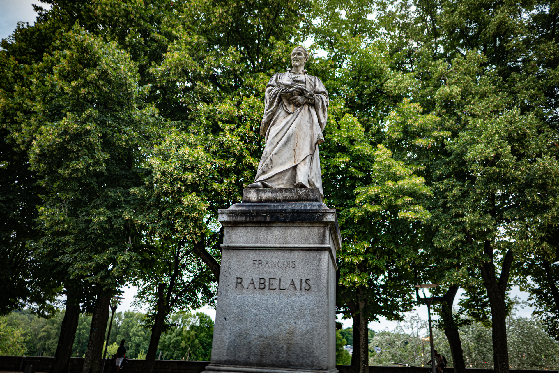 On passe tellement de fois en voiture devant lui, au visage noirci, surplombant le rond-point de cette pauvre fac décrépite qui a porté son nom mais depuis 2017 ne le porte plus, ça la fiche mal, la littérature. Alors il continue de noircir et regarde d’en haut la circulation, le soir il s’évanouit dans la nuit et ça va un peu mieux, sauf là en été avec une guinguette à ses pieds pour la bière et la promiscuité mais il la surplombe d’encore plus haut, et noirci ça se voit moins dans la nuit. De toute façon il ne ressemble pas à Rabelais mais pas du tout, on ne sait pas à quoi ressemblait Rabelais, peut-être le plus ressemblant est-il le buste de cuivre qui s’oxyde dans la cour de la mairie de Seuilly au-dessus du distributeur de baguettes molles, c’est peut-être aussi bien qu’il ne ressemble pas à Rabelais, tout le monde s’en fout de Rabelais — et certainement pas, le petit râblé au gros cou, à cet échalas en toge romaine défraîchie se tenant le bide pour contrecarrer envie pressante depuis 150 ans qu’il est là : marbre de M. Henry Dumaige, 2m74 de haut et posée d’abord ailleurs puis poussée là —, et je ne sais même pas s’il m’a vu qui le photographiait, moi j’ai d’autres motifs de penser à Rabelais et la solitude où on est pour penser à Rabelais et que c’est peut-être ça désormais la vraie porte pour entrer dans son livre et y grandir. Des fois on se dit qu’un coup de bulldozer serait plus digne, au moins ce ne serait plus son nom qui vieillirait ici, entre la grande roue à trois balles et le débouché du parking souterrain, la pauvre fac décrépite en permanents travaux (même la queue au resto U, de l’autre côté de la rue, lui tournera le dos quand reprendra le flux de masse pour les recalés de Parcours Sup qui se retrouvent là à ne pas le lire dans l’université de Tours débaptisée). « Ce monde ne faict que resver, il approche de sa fin », ce sera encore demain.