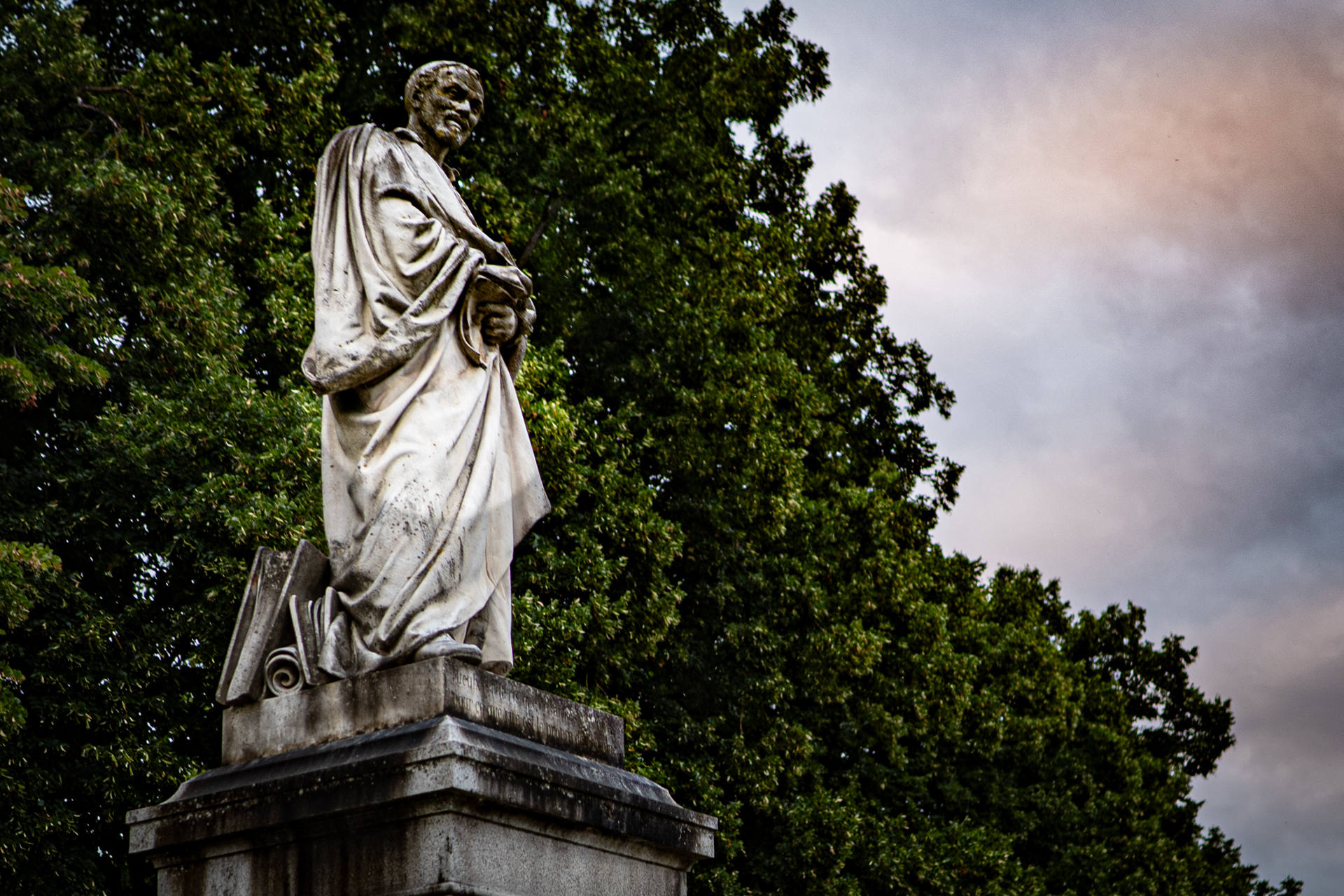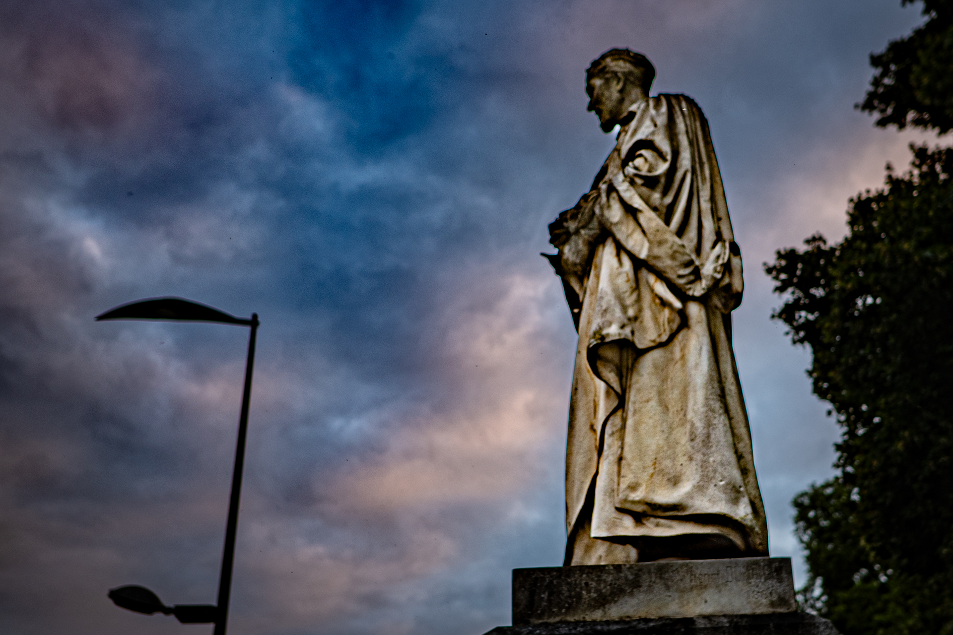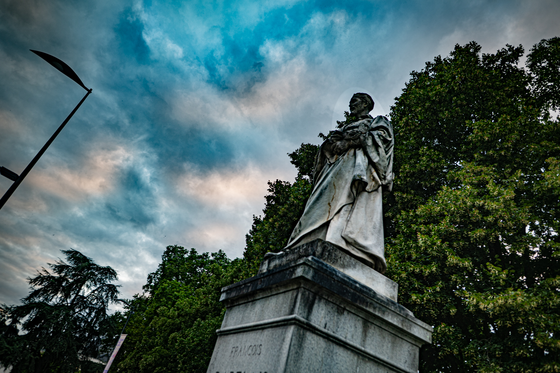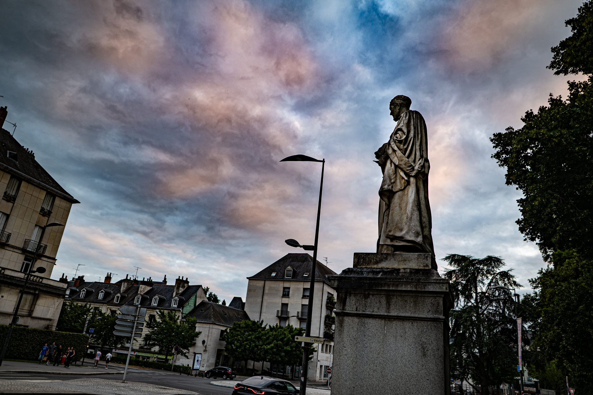 On passe tellement de fois en voiture devant lui, au visage noirci, surplombant le rond-point de cette pauvre fac décrépite qui a porté son nom mais depuis 2017 ne le porte plus, ça la fiche mal, la littérature. Alors il continue de noircir et regarde d’en haut la circulation, le soir il s’évanouit dans la nuit et ça va un peu mieux, sauf là en été avec une guinguette à ses pieds pour la bière et la promiscuité mais il la surplombe d’encore plus haut, et noirci ça se voit moins dans la nuit. De toute façon il ne ressemble pas à Rabelais mais pas du tout, on ne sait pas à quoi ressemblait Rabelais, peut-être le plus ressemblant est-il le buste de cuivre qui s’oxyde dans la cour de la mairie de Seuilly au-dessus du distributeur de baguettes molles, c’est peut-être aussi bien qu’il ne ressemble pas à Rabelais, tout le monde s’en fout de Rabelais — et certainement pas, le petit râblé au gros cou, à cet échalas en toge romaine défraîchie se tenant le bide pour contrecarrer envie pressante depuis 150 ans qu’il est là : marbre de M. Henry Dumaige, 2m74 de haut et posée d’abord ailleurs puis poussée là —, et je ne sais même pas s’il m’a vu qui le photographiait, moi j’ai d’autres motifs de penser à Rabelais et la solitude où on est pour penser à Rabelais et que c’est peut-être ça désormais la vraie porte pour entrer dans son livre et y grandir. Des fois on se dit qu’un coup de bulldozer serait plus digne, au moins ce ne serait plus son nom qui vieillirait ici, entre la grande roue à trois balles et le débouché du parking souterrain, la pauvre fac décrépite en permanents travaux (même la queue au resto U, de l’autre côté de la rue, lui tournera le dos quand reprendra le flux de masse pour les recalés de Parcours Sup qui se retrouvent là à ne pas le lire dans l’université de Tours débaptisée). « Ce monde ne faict que resver, il approche de sa fin », ce sera encore demain.