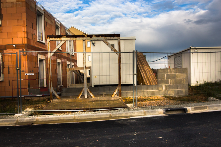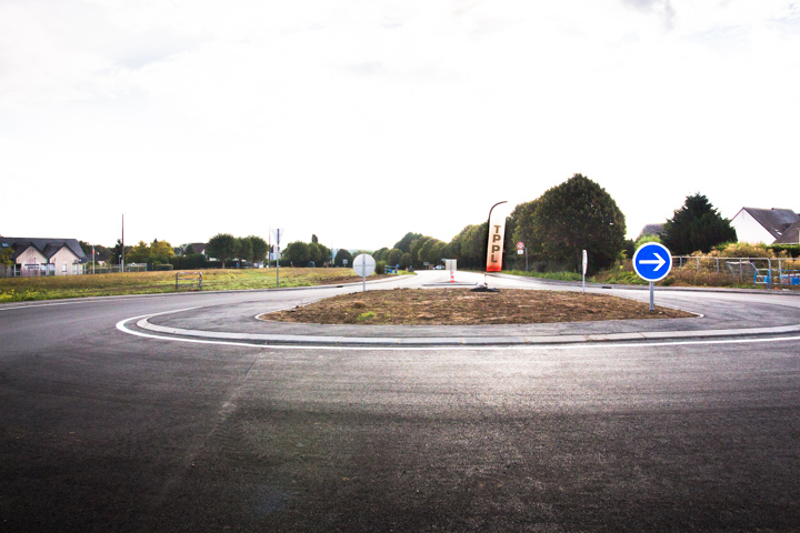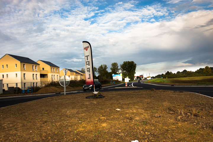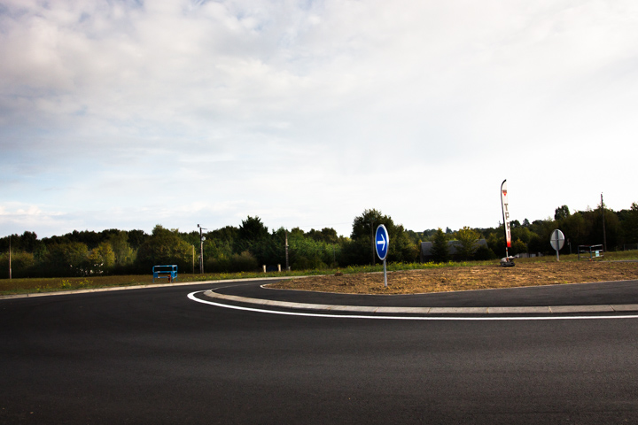 Il y a même pas un mois, j’étais passé là et il n’y avait qu’une moitié de rond-point. Je voulais voir un rond-point tout neuf, mais avec à peine trois semaines d’âge un rond-point nu paraît déjà très vieux. Juste de la terre, et le fanion de l’entreprise de ponts et chaussées.