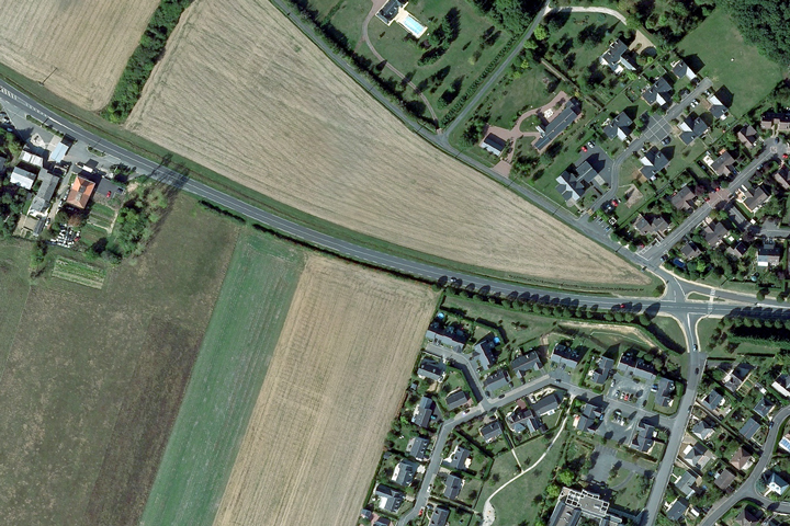 Ici, au long de la vieille route de Laval. Il y a déjà des implantations urbaines, comme par jets : on aperçoit la station-service (elles se font rares, en ce genre de lieu). Si on regarde la vue aérienne pourtant récente, rien que ce champ en longueur.