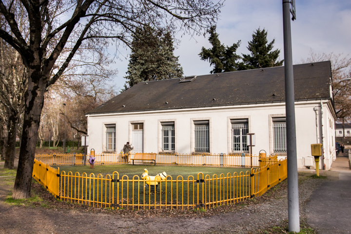 C’est l’exercice que je lui ai demandé à brûle-pourpoint, ci-dessus : voilà une crèche aux fenêtres à barreaux, close sur elle-même, dans un point de circulation piétonne important (entre les bâtiments et le petit centre commercial), et pour les enfants un enclos grillagé dans une angle qui sert de parking à bus, avec deux balancelles sur ressort. Et c’est dans cet exercice-surprise qu’il me rend surprise à moi aussi, suggérant de renforcer les grilles et les élever pour recréer un intérieur à l’extérieur, et de transformer le toit de la crèche en espace public en y aménageant une terrasse en surplomb du quartier. Accessoirement, c’est comme ça qu’il est amené à prononcer cette phrase : « pas besoin de détruire pour transformer ».