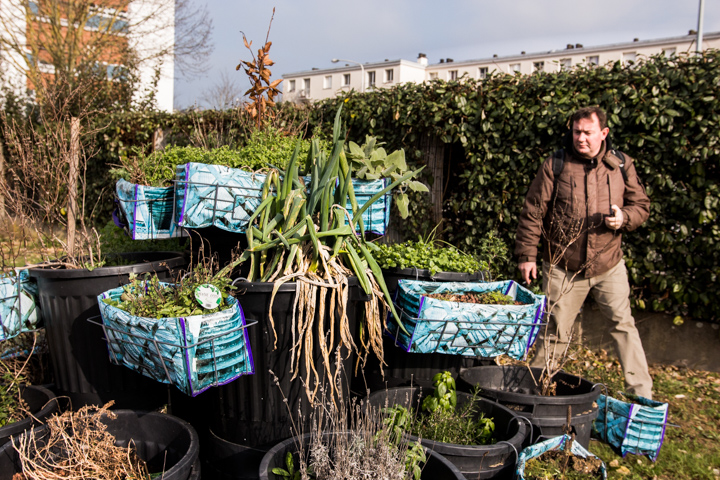 Mais jardin alors comme les autres, dispositif seulement social ? Non, quand on remarque, dans le jardin des aromates, toute une mosaïque de couleurs : carrelages récupérés de la barre démolie, et qui deviennent ici comme la présence colorée du sol même. Ou bien, dans le rectangle horizontal clos sous la verticalité des façades, une étrange sculpture-totem. Et quand on approche, une construction faite de sac souples, transformés en jardinières. « On a distribué plus de soixante jardinières mobiles, avec leurs graines. Puis on a inventé notre propre aromate, mélange de six épices. Fabriquer un objet qui symboliser l’expérience, mais un objet vivant. Les jardinières prolongent le jardin chez tous ceux qui en accueillent une. »