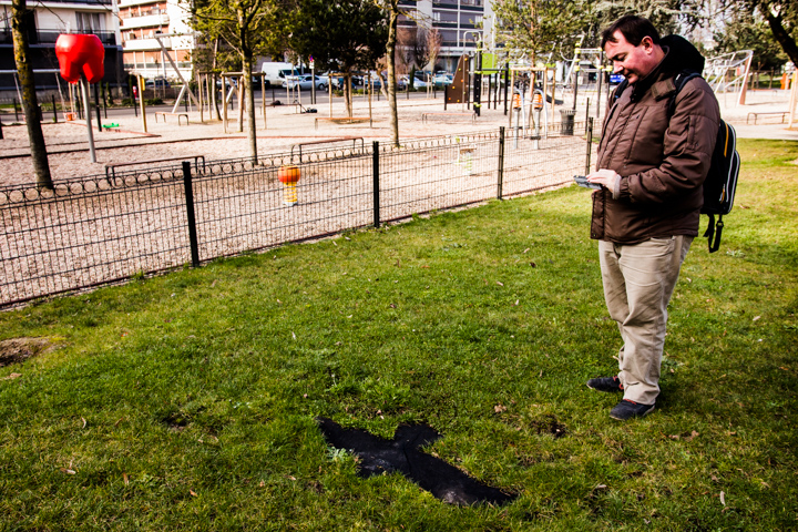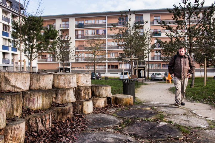 Quelques cent mètres plus loin, on est revenu au coeur même du quartier, l’emplacement de la barre démolie, transformée en jardin. Simarik est intervenu dans la partie sud : des oiseaux migrateurs forment une signalétique implantée dans le sol, reliant l’espace clos du jardin à l’espace ouvert de la ville. Ils ne sont pas arrêtés, c’est du bois qui évolue avec le sol : « ils commencent à être bien, mes oiseaux, dit Simarik, ils noircissent ».