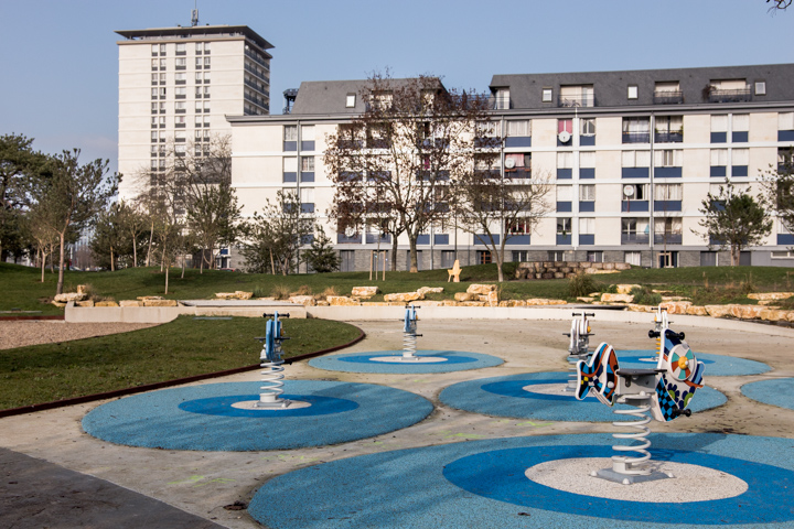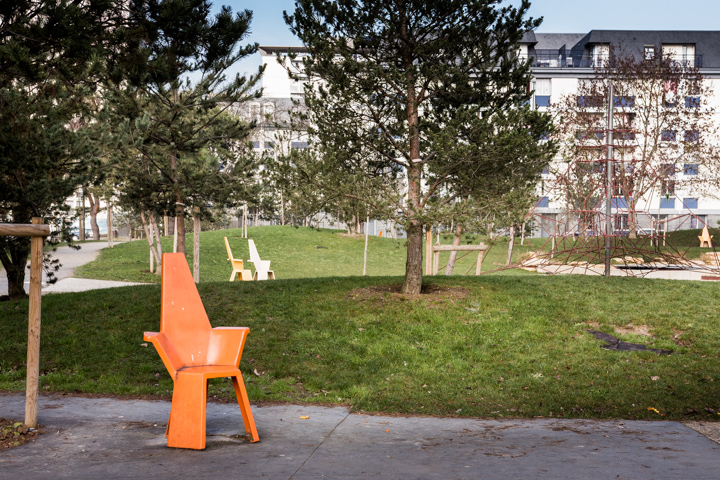 Avec les habitants, ils ont conçu des sièges, soit individuels, soit par deux, qui rompent avec le banc public sempiternel (quoi qu’en ait fait Brassens). De l’oiseau on passe à l’oeuf, ou plutôt un motif découpé de la boîte à oeufs, puis agrandi. Pas facile, pour un objet exposé à toutes les intempéries. « Les services-municipaux appellent ça le test de la belle-mère : 150 kilos de ciment sur les assises... » Dans la multiplicité des signes urbains, les points fixes colorés des sièges de Nicolas Simarik reconstituent comme une carte géographique, un repère qui sépare l’aire de promenade et de jeu de la vibration de la ville.