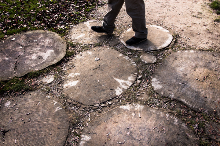Et de l’oeuf au nid : dans un repli de l’allée, des souches et tronçons de bois incitent à s’immobiliser, s’enfoncer et rêver. On finit par comprendre que c’est dû à l’inégalité parfaite de la composition de ce petit amphithéâtre, et parce que le sol aussi est fait de rondins affleurants. Je m’étonne de leur diamètre : « C’était le séquoia géant du jardin botanique. Il était malade. Quand ils l’ont abattu, ils ont donné une journée de congés aux jardiniers de la ville, ils sont tous venus. Une grue l’a découpé progressivement, par tronçons de 9 mètres, j’ai demandé un de ces tronçons. Les autres viennent d’un cède des Prébendes, abattu par une tempête. » Ainsi, deux arbres emblématiques de la ville continuent-ils de participer à sa vie et son temps.