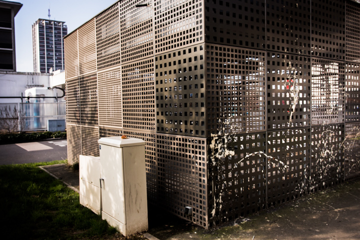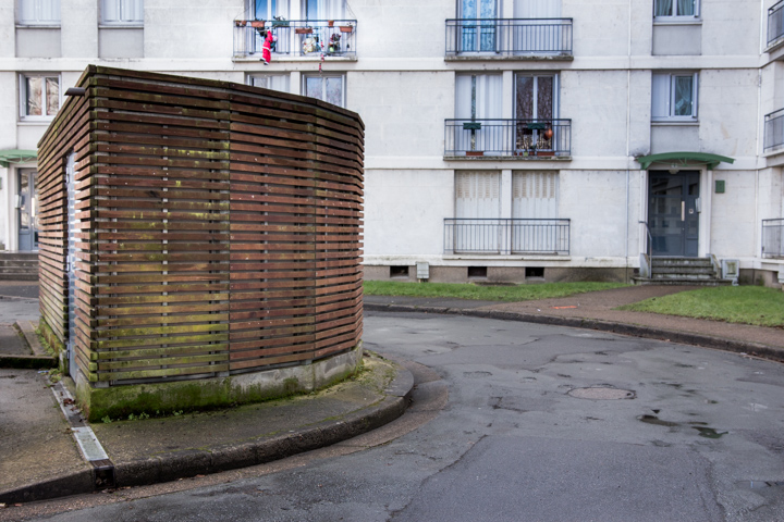 Dès qu’on sort du jardin, c’est un autre objet sur lequel il attire mon attention. Ça ne me plaît pas. Quand on marche dans la ville, le regard est sélectif. On porte attention à ce qui se déplace, mais ce qui est sans signe ni utilité personnelle, on l’ignore. Tout simplement, cette grande cage sombre je ne l’avais pas vue. Une fois que Nicolas se sera arrêté devant celle-ci, je verrai toutes les autres. Il a semblé logique aux urbanistes, lors de la rénovation du quartier, de prévoir des abris à vélo protégés, qui évitent de les voir apparaître aux balcons, comme partout ailleurs. Ces abris pouvaient aussi être des sas : laisser son deux-roues ici et rejoindre le centre-ville en tram... Manifestement, tous sont vides et désertés.