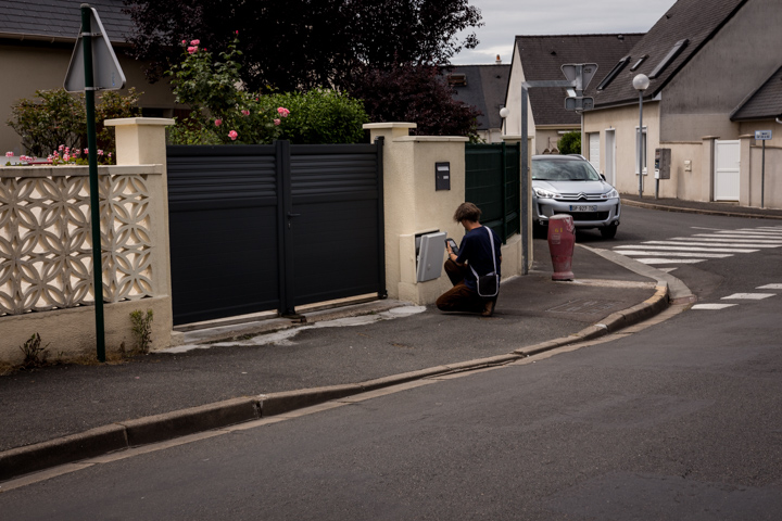 Et puis en sortant, voir photo ci-dessous, j’ai fait connaissance d’un jeune type qui exerçait un métier bien proche et complémentaire du mien : le mesureur de littérature. Devant chaque maison, avec son appareil, il mesure l’activité littéraire, la présence des livres, leur usage, l’activité d’écriture dont on les accompagne. C’est une profession importante, mesureur de littérature, dans la périphérie de la ville, si on veut que ce qui compte pour nous soit aussi d’importance pour la communauté.