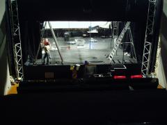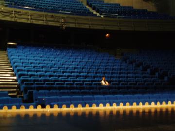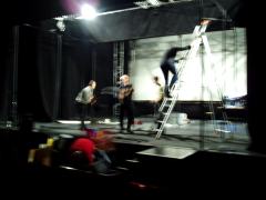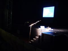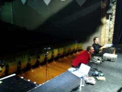 La lecture Rolling Stones a lieu dans un ancien cinéma, Le Concorde, qu'utilise le théâtre du Manège pendant la réfection de sa petite salle à l'italienne. Moi, les sièges cinéma, la salle incurvée et l'impression du temps qui cesse, ça me va très bien. Seulement, l'après-midi, on y a joué un spectacle pour enfants. Le démontage ne commence qu'à 17h, et ma lecture est à 19h... Simon Juin est un as du Mac, il me fera mon initiation à la gestion des deux écrans pour piloter le vidéo-projecteur en même temps que mes extraits iTunes, et lui qui me conforte dans l'idée de lire assis là, sur le bord de scène, les pieds sur l'escalier de bois et l'ordinateur posé à même le sol, à main droite. Devant moi, il place un AKG 535, micro statique, c'est à ça qu'on reconnaît les congnoisseurs... On vérifie, tout marche, dire que je n'ai pas la trouille serait mensonge.