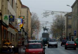 Ces 3 jours à La Roche/Yon, toutes mes photos seront floues. Il n'y a aucune raison pourtant, sauf que je préfère ne pas utiliser le flash, que je n'ai pas mon pied monopode, et que de toute façon, tout dans cette ville est si chargé pour moi de noms, de mémoire, d'images disparues, qu'il y a un écran, une protection à instaurer: je n'ai pas affaire au réel, mais à la trace matérielle impalpable de ma propre mémoire. Mes sensations d'enfance, quand il s'agit de La Roche/Yon, c'est les rues très longues se croisant à angle droit, comme si les maisons bases s'étalaient à l'infini, c'est les bâtiments administratifs comme si leur splendeur gardait un peu de l'idée de la ville garnison originelle, enfin Napoléon lui-même, qui veille aux carrefours, même de très loin (et je dormirai à l'hôtel Napoléon pour compléter...) Plus le garage Panhard tenu par l'ami de mon grand-père, Maxime Dervieux, et tandis que les adultes s'attardaient au repas, nous les gosses l'immense garage à étage nous servait de terrain de jeu, désert et silencieux, et chacune des voitures (Dyna, PL 17, Panhard 24) comme un havre ou un navire, on s'y enfermait, on y rêvait. Le garage des Dervieux était à un coin de rue, et comportait une rampe pour passer du rez-de-chaussée à l'étage. C'est un souvenir de La Roche/Yon, mais séparé de la Roche/Yon. Le reste des images, c'est la préfecture napoléonienne, ces carrefours à angle droit, ces longueurs, et que si on vient là c'est pour une corvée.