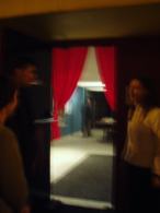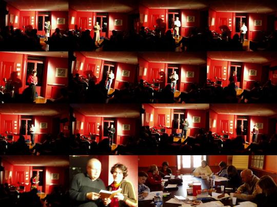 Les murs de la salle d'expo sont peints d'une épaisse sanguine, et nous l'avons équipée de deux mandarines. Chacun lira avec son corps dans la lumière. On a l'appui de vrais théâtreux dans le stage pour franchir des marches supplémentaires. Prolongations à la brasserie Clémenceau, le serveur c'est presque un gars du stage lui aussi (en plus, je suis sûrt qu'il en aurait, des trucs à dire). à la brasserie Clémenceau, on est le midi, le soir, et même au milieu de la nuit, du coup je perds un peu la notion du jour et de la nuit, surtout que je repasse à la pause par l'hôtel Napoléon pour m'allonger une demi-heure: on prépare ces stages trois jours, on les vit comme un tunnel d'énergie, et c'est le lendemain, au retour, qu'on est tout surpris d'être rétamé, à zéro, pour encore tout un jour. Restent les textes. Restent les voix, si précises dans la tête. Les voix sont nettes, pour ça que les photos sont floues.